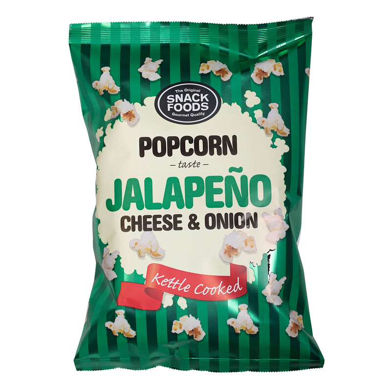 Popcorn m. jalapeños-, løg- og ostesmag Popcorn Jalapeño Cheese & Onion fra Snack Foods er popcorn med en skøn smag af jalapeño, ost og løg. De er allerede tilberedte, så du kan nyde dem med det samme. Servér for eksempel popcornene til en hyggelig filmaften i gode venners lag. Eller nyd Popcorn Jalapeño Cheese & Onion som en smagfuld snack i løbet af dagen. 9,95 kr Køb