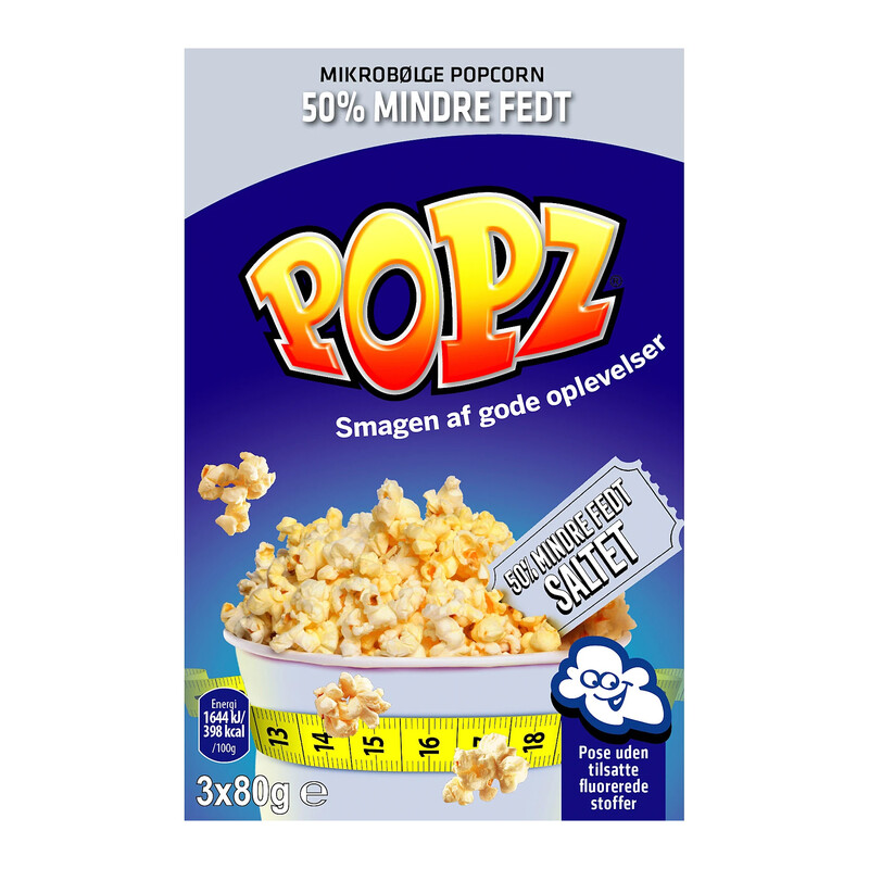 Popcorn m. salt til mikrobølgeovn fedtreducerede Popz Microwave Popcorn med 50% mindre fedt er mikrobølgepopcorn, som er perfekte til dig, som gerne vil spare på fedtet. Popcornene er færdigpoppede efter få minutter i mikrobølgeovn. Server popcornene til dine gæster, som en lækker snack efter en god middag. 24,95 kr Køb